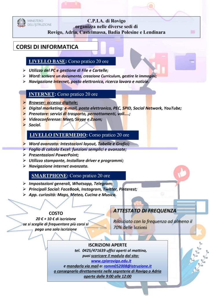 Sono riaperte le iscrizioni per i corsi di informatica nella sede di Rovigo. E’ possibile scaricare il seguente MODULO-iscrizione-INFORMATICA 2021 – 22 e inviarlo compilato all’indirizzo mail romm052008@istruzione.it oppure consegnarlo di persona alla segreteria di Rovigo.
